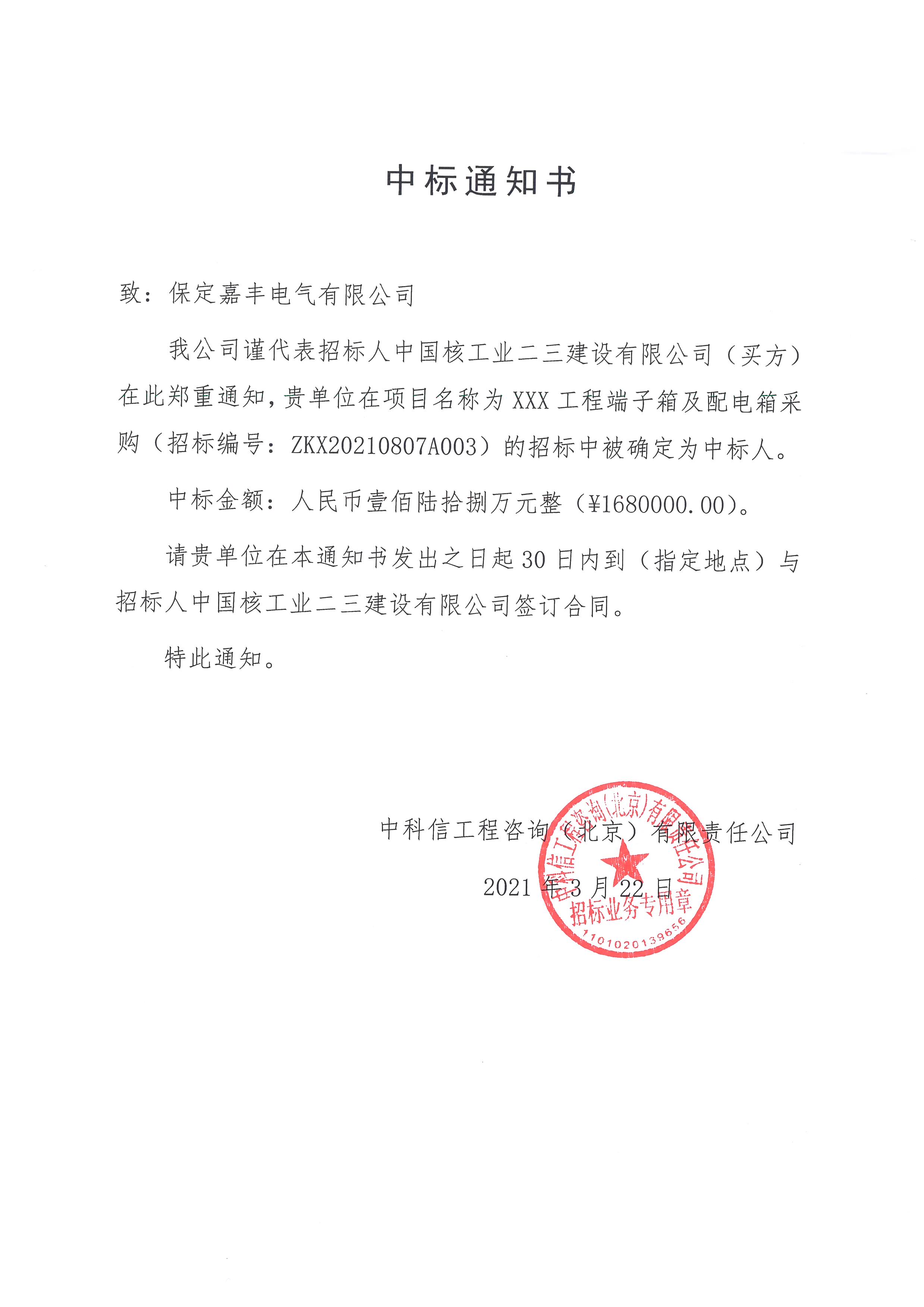我公司中标中科信工程咨询(北京)有限责任公司组织招标的中国核工业二三建设有限公司