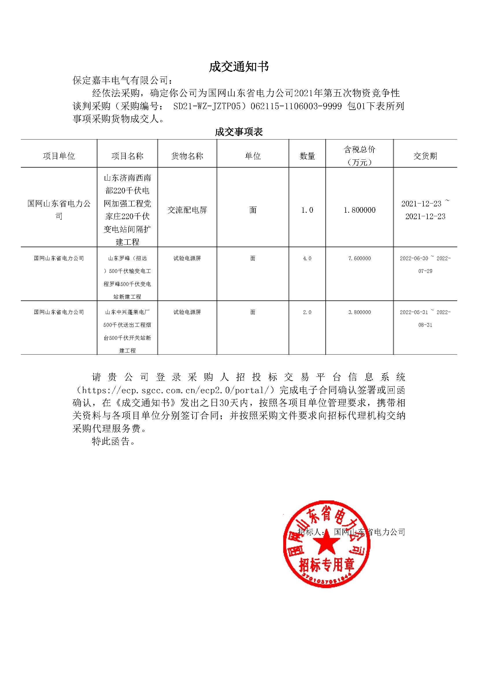由山东鲁能三公招标有限公司组织招标的国网山东省电力公司2021年第五次物资竞争性谈判采购试验电源屏交流配电屏,中标金额132000元
