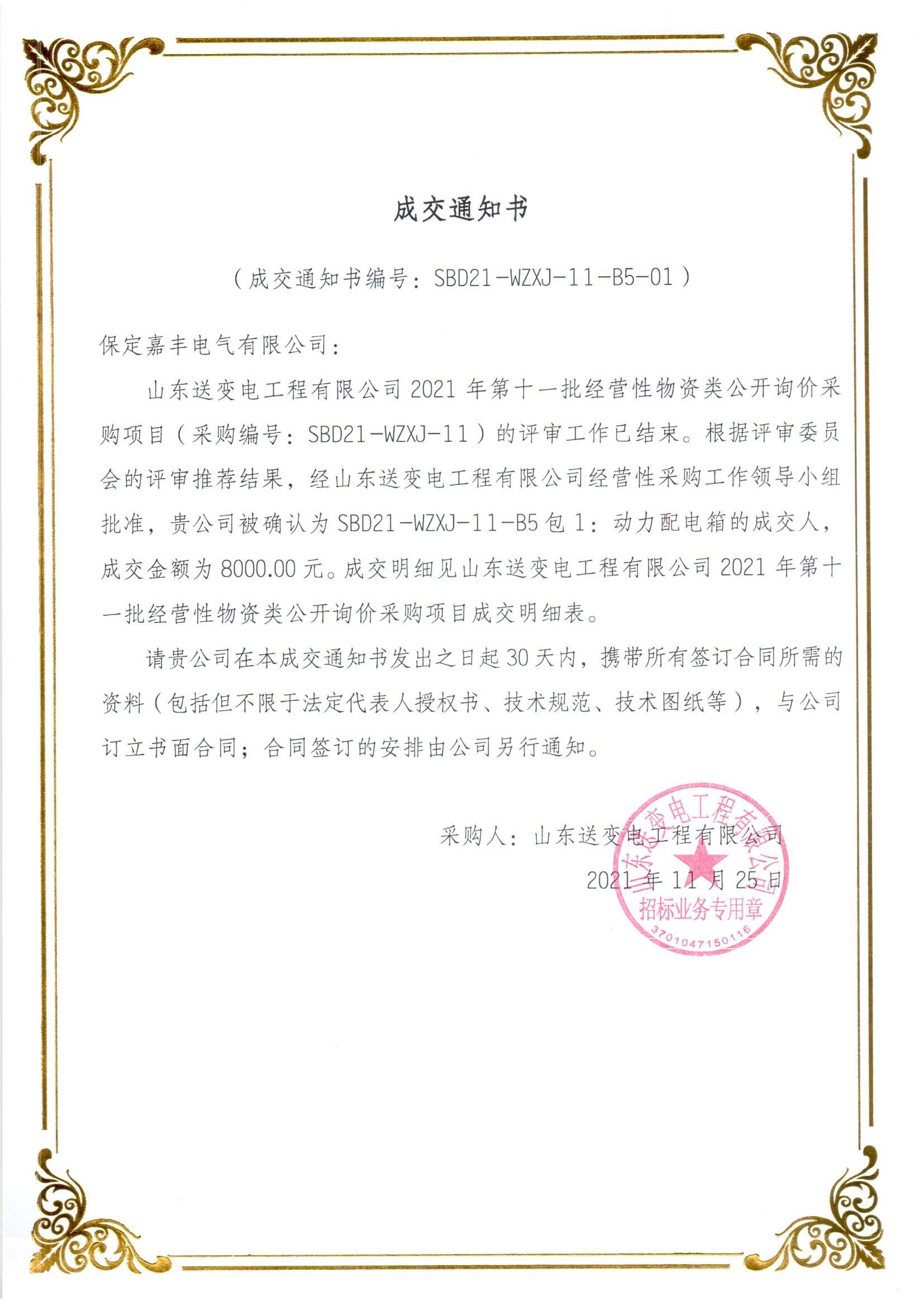 由山东送变电工程有限公司组织招标的山东送变电工程有限公司2021年第十一批经营性物资类公开采购项目动力配电箱中标金额8000元