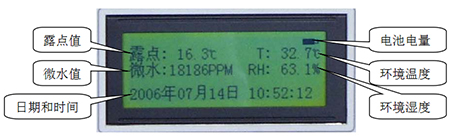 显示清晰:液晶屏直接显示露点、微水(ppm)、环境温度、环境湿度、时间及日期、电池电量等内容。